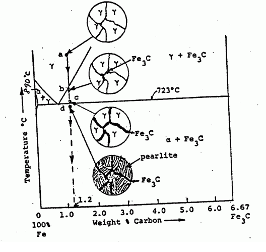 - 온도가 내려감에 따라, 단상 오스테나이트(감마철)에서 2상 페라이트 및 탄소-카바이드 화합물로 변이한다. (중간에 알파철 + 감마철 단계 있음)