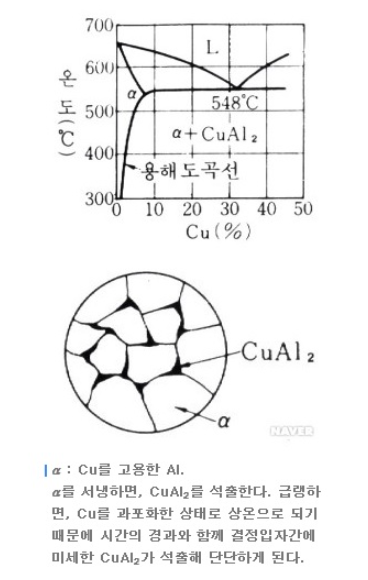 이후 천천히 냉각을 시키면 고체A내 고체 B(Al-Cu합금에서는 Cu)가 석출되면서 단단해짐