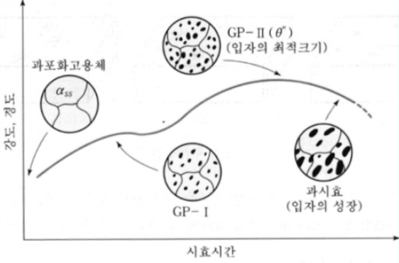 과포화 고용체 → GP I (알루미늄 기지조직과 정합관계를 가지는 용질원자 집합체) → (시효진행) → GP II (시간에 따라 Cu원자들이 이용해서 모임 → (시효진행) → 시간이 지나 Cu원자가 모여 CuAl2 조성을 가지는 θ' 석출물 생성 (점점 강도 감소) → 과시효되어 Al 결정립계에 θ라는 CuAl2 석출물이 석출 (좀 더 연화됨)