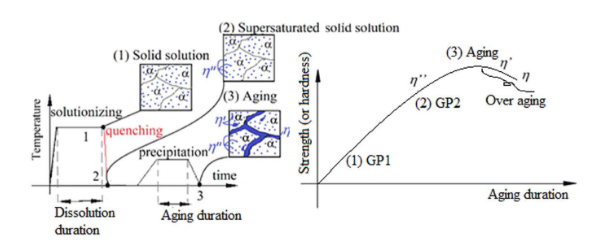 (이때 상온방치하면 자연시효, 100 ~ 150도로 가열해 석출을 촉진하면 인공시효)